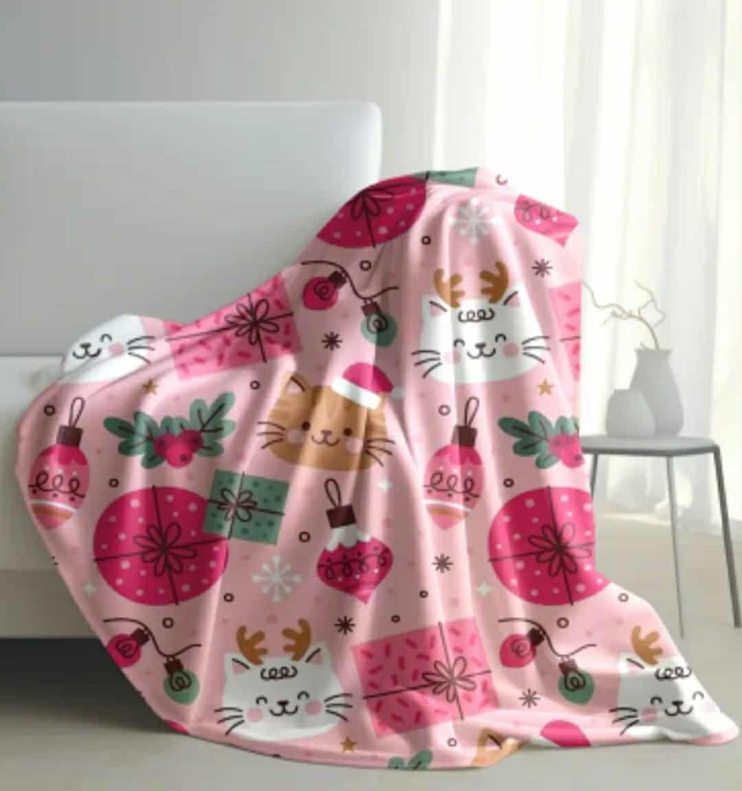 Heerlijk zacht roze kerstdekentje met schattige katjes – 130x150 cm